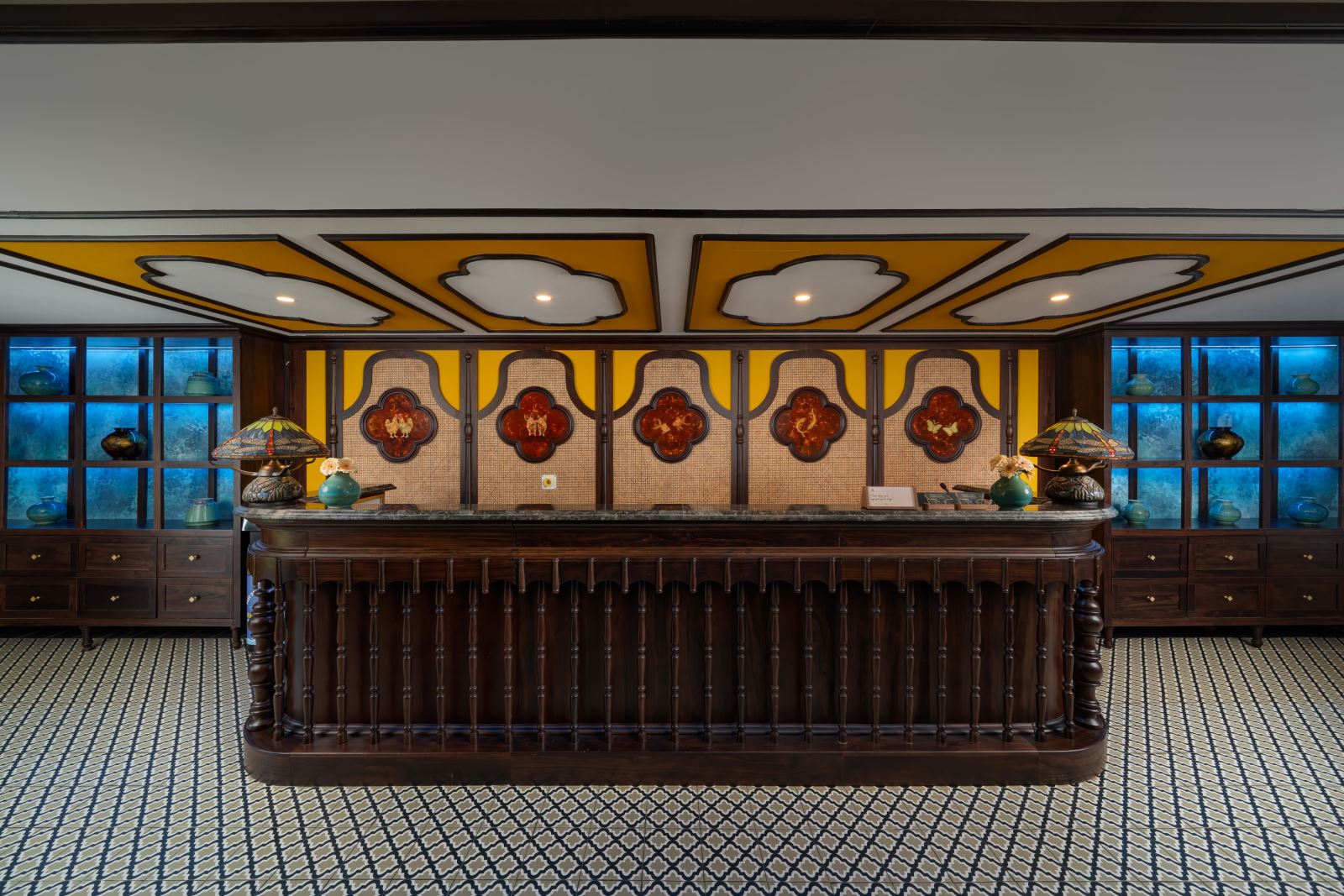 Located on the first deck, the 24/7 Reception of Indochine Grand Cruise serves as the heart of guest services and the starting point for every excursion. Guests may enjoy complimentary water refills while receiving attentive assistance from our professional crew at any time of day. Designed for moments of calm before each adventure, the reception lounge features deep red sofa cushions, warm wood tones, handcrafted natural chairs, and elegant oil paintings, creating a refined Indochine ambiance that invites relaxation and anticipation of the journey ahead.