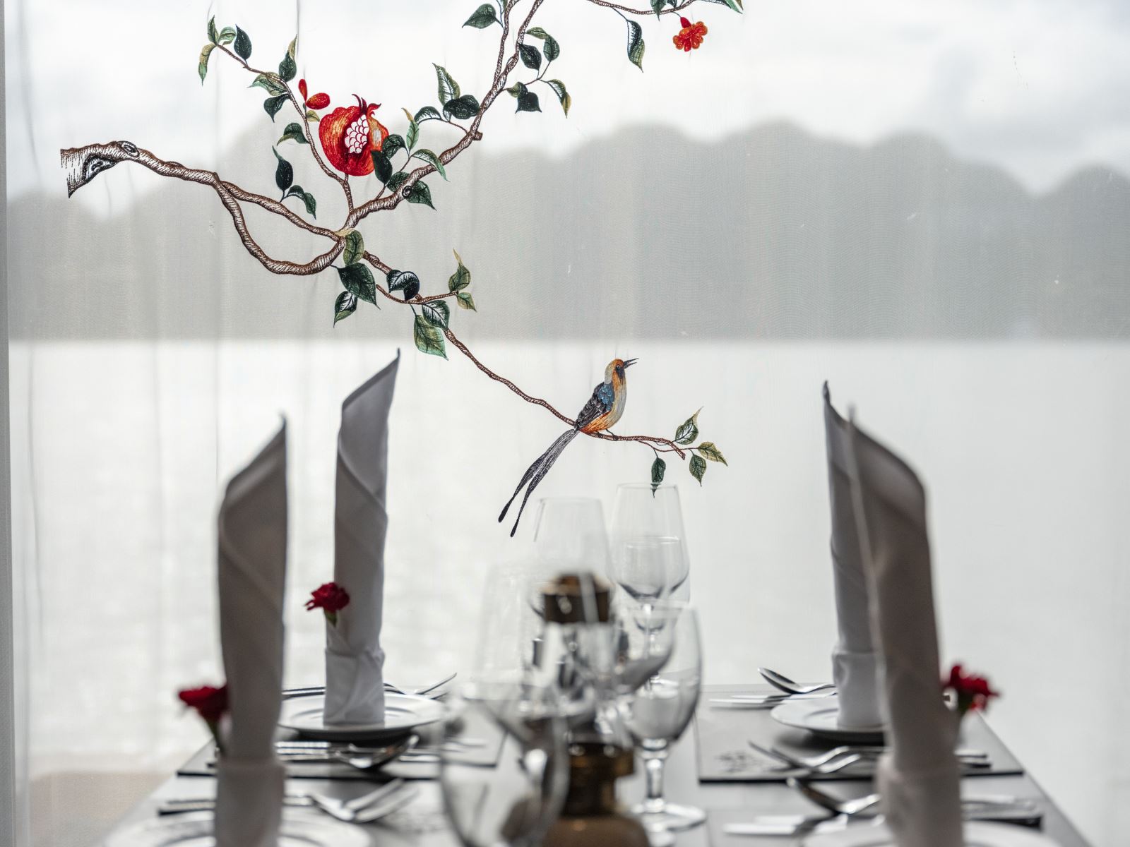 Located on the second deck of Indochine Grand Cruise, Tonkin Restaurant is a refined culinary destination where French Indochine heritage meets contemporary haute cuisine. The elegant interior is adorned with warm tropical hues, handcrafted wooden finishes, and timeless design details, creating an atmosphere of quiet sophistication and cultural depth. Expansive floor-to-ceiling windows open to breathtaking, uninterrupted views of the heritage bay, allowing guests to dine amidst the ever-changing beauty of limestone karsts and tranquil waters.