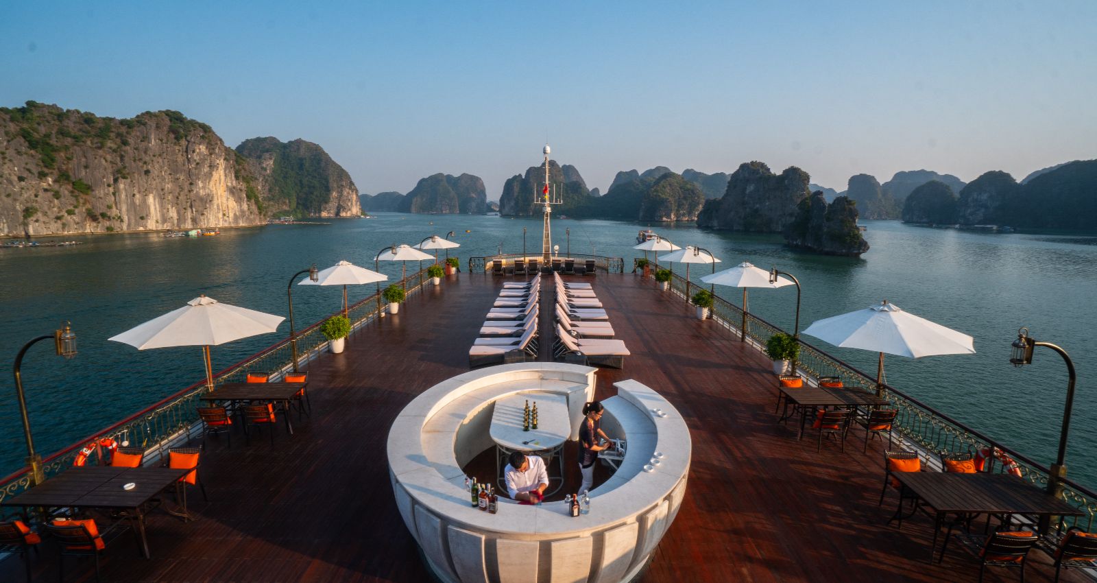 Experience Lan Ha Bay from its largest sundeck, a sprawling 1,100m² space on the 4th deck featuring both open-air and sheltered viewing areas. The highlight is the Infinity Deck at the stern, a breathtaking panoramic spot perfect for sunset photography, romantic dinners, or exclusive canapé parties.